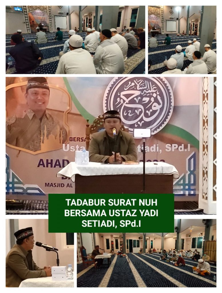 Acara ini kemudian dilanjutkan dengan pengajian rutin hari Ahad, dengan materi Tadabbur Surat Nuh, oleh Ustadz Yadi Setiadi, SPd.I